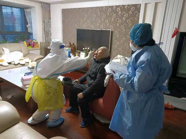 孫麗群(右)與醫(yī)護(hù)人員一同上門為居家老人做核酸檢測。受訪者供圖