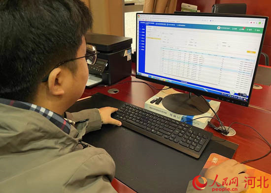 工作人員通過河北省建筑工人實名制和分賬制管理公共服務平臺監(jiān)測某項目農(nóng)民工考勤記錄。 人民網(wǎng) 林福盛攝