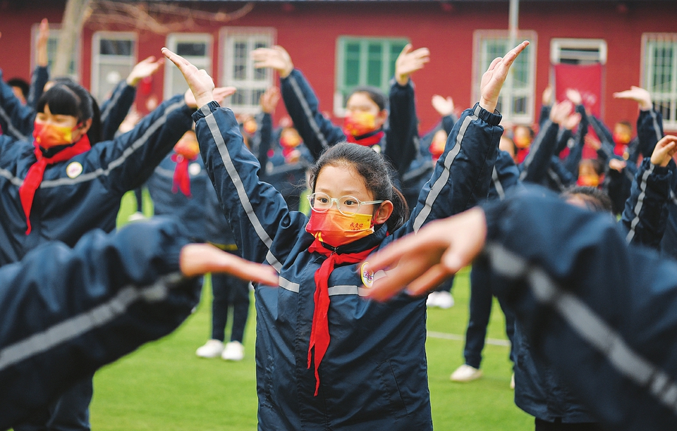 3月24日,臨汾市興國實(shí)驗(yàn)小學(xué),師生們在課間跳律動(dòng)減壓操。連日來,該校結(jié)合閉環(huán)管理,為全校師生量身編排了律動(dòng)減壓操和手舞操,使學(xué)生快樂學(xué)習(xí)、健康生活。(閆銳鵬攝)