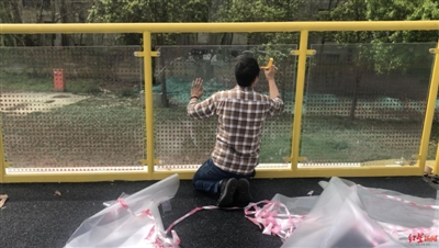 該座天橋大約有三分之一的玻璃護(hù)欄已經(jīng)貼上了膜。未貼膜的玻璃護(hù)欄有的橫著拉了兩條“警戒線”,有的拉了三條?!耙涣硕嗑镁湍苜N完了”,現(xiàn)場(chǎng)工作人員表示,“警戒線”是臨時(shí)措施,貼完膜就會(huì)取掉。