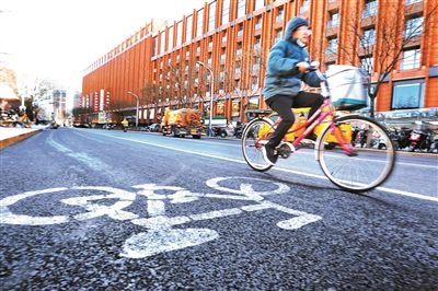 王府井慢行系統(tǒng)改造升級(jí)后,市民騎車經(jīng)過 攝/本報(bào)記者 黃亮