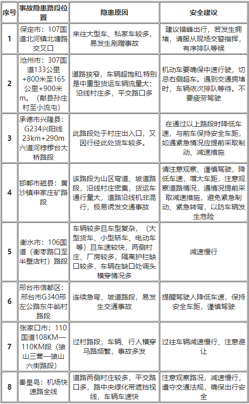 有可能出現(xiàn)大流量的站口:石家莊四個(gè)端口站、青銀趙縣口、京港澳七一口、大廣衡水北、首都環(huán)線(張涿段)野三坡、百草畔、百里峽。有可能出現(xiàn)擁堵的互通立交:京臺(tái)與京滬互通、新元與京港澳互通(南)。