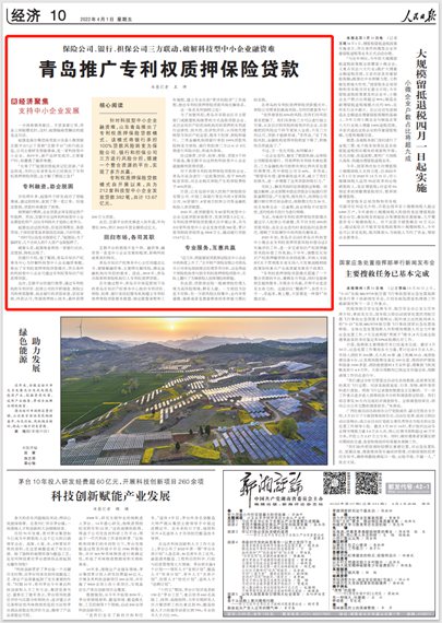 人民日報點贊青島:推廣專利權(quán)質(zhì)押保險貸款 破解科技型中小企業(yè)融資難