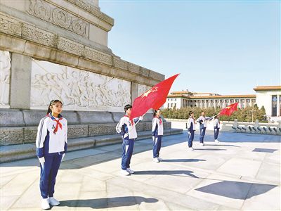 9時許,第一班少年先鋒崗隊員準(zhǔn)時上崗,6名少先隊員佩戴鮮艷的紅領(lǐng)巾,手戴白手套,高舉中國少年先鋒隊隊旗,邁著堅定有力的步伐走向人民英雄紀(jì)念碑,以紅領(lǐng)巾的名義,為人民英雄站崗。