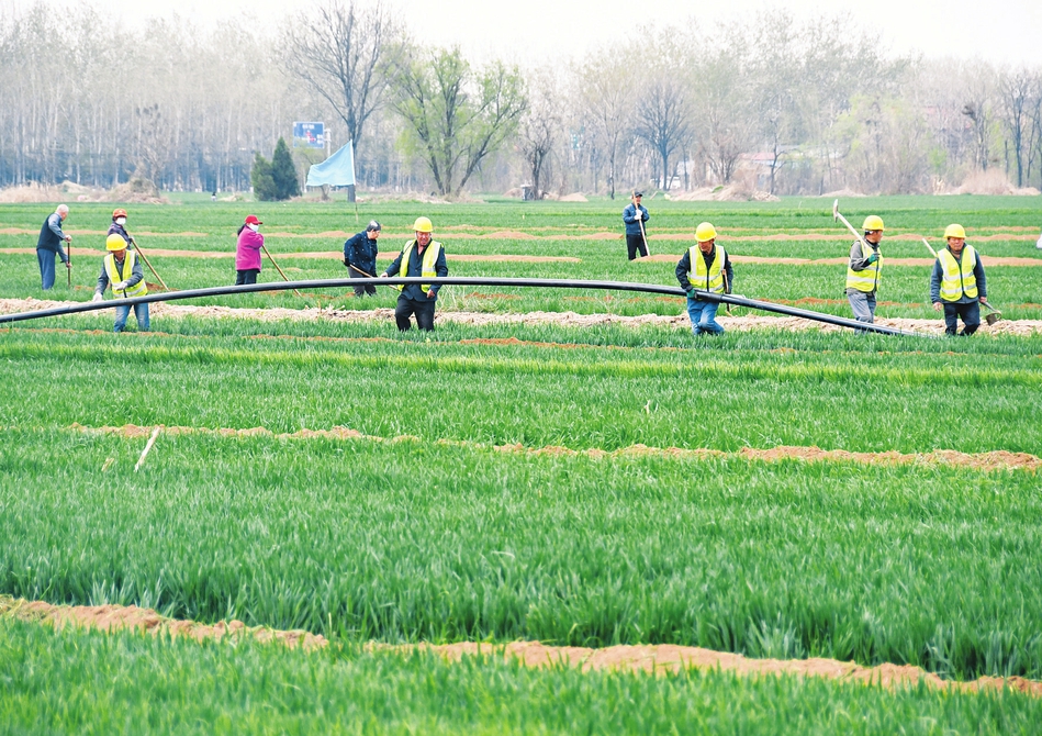 4月2日,在翼城縣南梁鎮(zhèn)梁壁村高標準建設(shè)農(nóng)業(yè)生產(chǎn)基地,技術(shù)人員在安裝節(jié)水管道。該基地著力在“高效節(jié)水”上蹚出一條新路徑,通過智能管灌、智能噴灌、智能滴灌三項高效節(jié)水措施,為農(nóng)業(yè)灌溉充分利用地表水、合理使用淺層水、嚴控地下水提供先例打好基礎(chǔ),確保糧食豐產(chǎn)增收。(閆銳鵬攝)