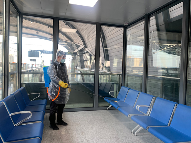 在站臺、站廳等重點(diǎn)區(qū)域,盡管沒有了客流,海寧運(yùn)營公司根據(jù)車站實(shí)際需求維持了每日3至4次的消殺頻次。