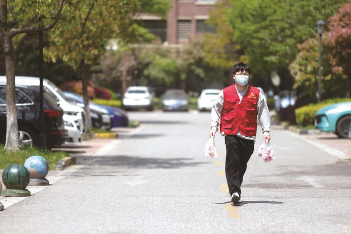 4月6日上午,在嘉興秀洲區(qū)高照街道運秀社區(qū),社區(qū)黨員志愿者李斌行走在給居民送藥的路上。