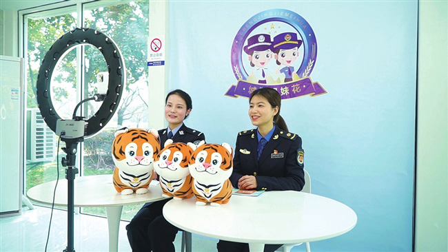 湖州市安吉縣綜合行政執(zhí)法局與安吉縣公安局近日聯(lián)合建立“城警姐妹花”品牌,以直播的形式開展普法宣傳活動(dòng)。(潘瑞安、王豆豆)