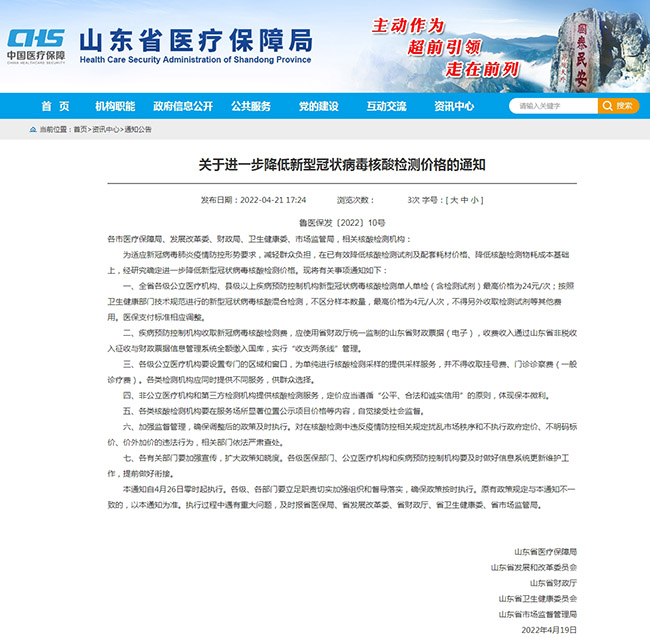 人民網(wǎng)濟(jì)南4月22日電(聶俊穹)21日,山東省醫(yī)保局、省發(fā)改委、省財(cái)政廳、省衛(wèi)生健康委、省市場監(jiān)管局等五部門聯(lián)合印發(fā)文件,自2022年4月26日零時(shí)起,進(jìn)一步降低新型冠狀病毒核酸檢測價(jià)格。