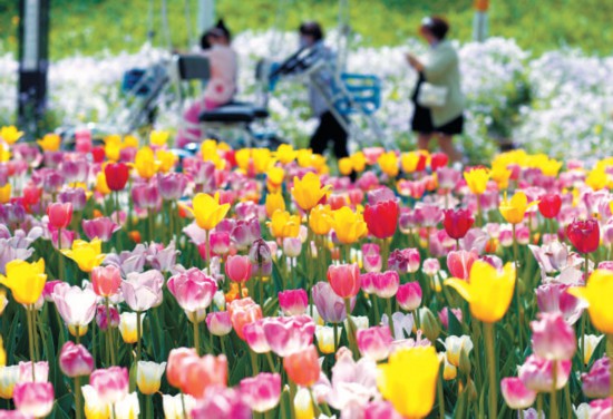 昨天,三三兩兩的游人漫步在世界花卉大觀園的郁金香花海中,感受暮春時節(jié)的色彩斑斕。園內(nèi)37種近20萬株郁金香,正在陸續(xù)開放。世界花卉大觀園還將舉辦首屆郁金香插花花藝大賽,貼近市民家庭園藝需求。 本報記者 劉平攝
