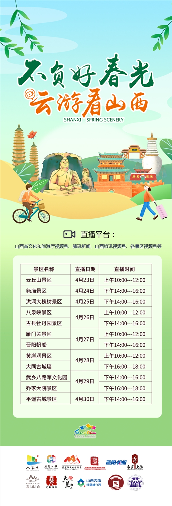 據(jù)了解,本次直播活動共有12家山西景區(qū)參與,包括平遙古城、云丘山景區(qū)、八泉峽景區(qū)、洪洞大槐樹景區(qū)、雁門關(guān)景區(qū)5家5A級景區(qū),以及堯廟景區(qū)、黃崖洞景區(qū)、武鄉(xiāng)八路軍文化園、古縣牡丹文化園、大同古城墻在內(nèi)的5家4A級景區(qū),還有喬家大院景區(qū)、晉陽帆船體驗項目的加入,為本次直播活動增添了別樣的趣味。直播活動將從4月23日開始持續(xù)到4月30日,每天上午10:00—12:00、下午14:00—16:00、16:00—18:00,共3個時間段進(jìn)行景區(qū)重點旅游資源推介、春季踏青賞花線路、以及城市周邊游等主題產(chǎn)品介紹。