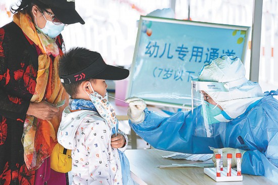 昨天(5月7日),朝陽區(qū)啟動新一輪大規(guī)模核酸檢測。為方便居民進行核酸采樣,減少交叉幾率,朝陽區(qū)小關(guān)街道奧林匹克文化廣場核酸檢測點設(shè)置“幼兒專用通道”,專為7歲以下兒童提供核酸檢測服務(wù)。本報記者 程功攝