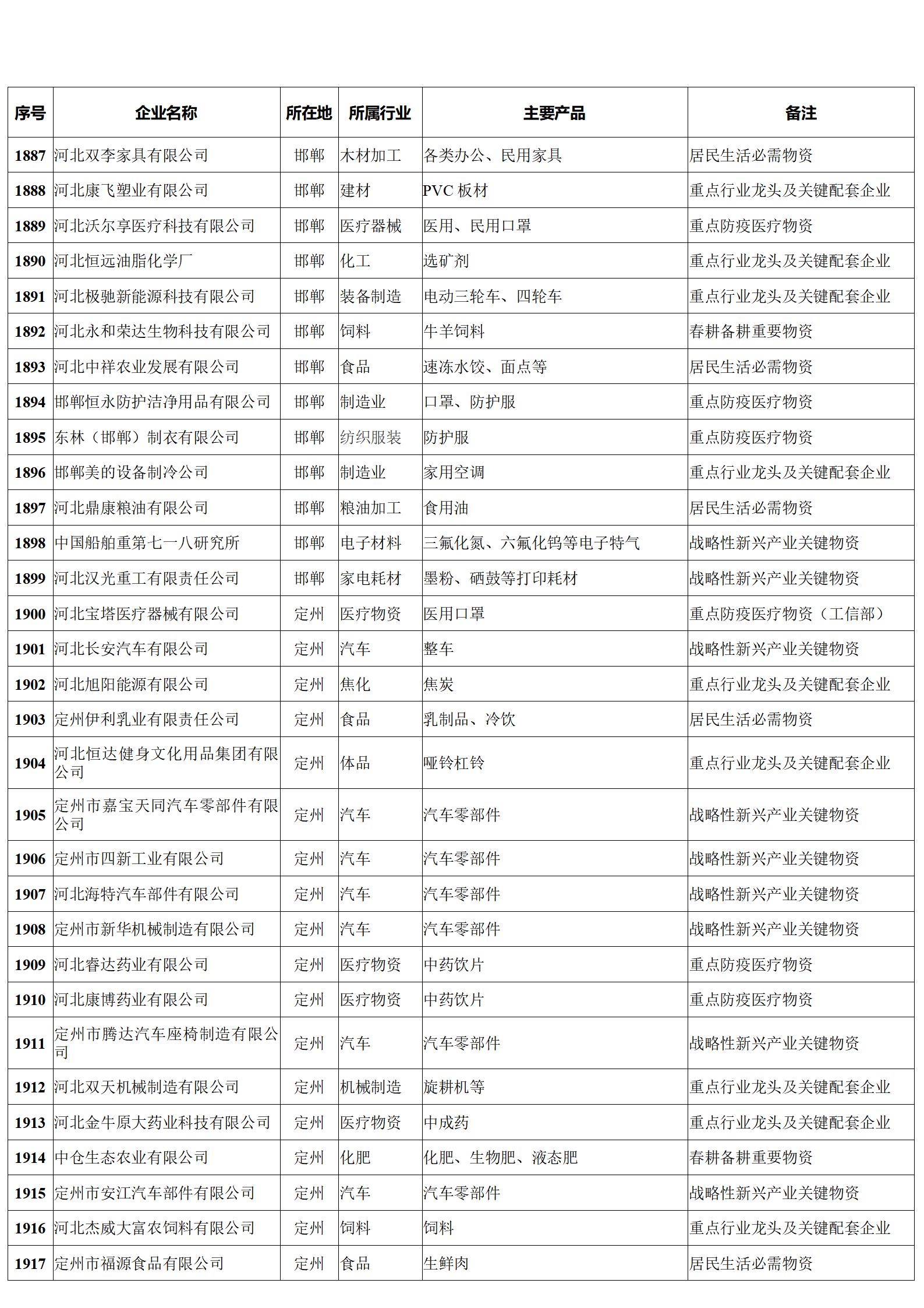 日前,河北省工信廳發(fā)布河北省首批重點產(chǎn)業(yè)鏈供應(yīng)鏈企業(yè)“白名單”,圍繞重點防疫醫(yī)療物資、居民生活必需物資、春耕備耕重要物資、戰(zhàn)略性新興產(chǎn)業(yè)關(guān)鍵物資、重點行業(yè)龍頭及關(guān)鍵配套企業(yè)等五個方面,共計1988家,其中重點防疫醫(yī)療物資企業(yè)258家、居民生活必需物資企業(yè)359家、春耕備耕重要物資企業(yè)50家、戰(zhàn)略性新興產(chǎn)業(yè)關(guān)鍵物資企業(yè)426家、重點行業(yè)龍頭及關(guān)鍵配套企業(yè)895家。