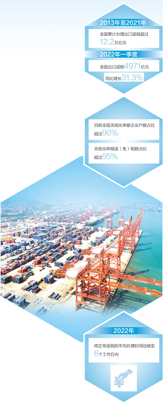近年來(lái),稅務(wù)總局持續(xù)擴(kuò)大無(wú)紙化申報(bào)覆蓋范圍,大幅減輕出口企業(yè)申報(bào)負(fù)擔(dān)。目前,全國(guó)無(wú)紙化申報(bào)企業(yè)戶(hù)數(shù)占比超過(guò)90%,無(wú)紙化申報(bào)退(免)稅額占比超過(guò)95%;稅務(wù)總局正會(huì)同相關(guān)部門(mén)研究推出進(jìn)一步提高出口退稅便利度等支持舉措,2022年內(nèi),正常退稅的平均辦理時(shí)間將壓縮至6個(gè)工作日內(nèi)。