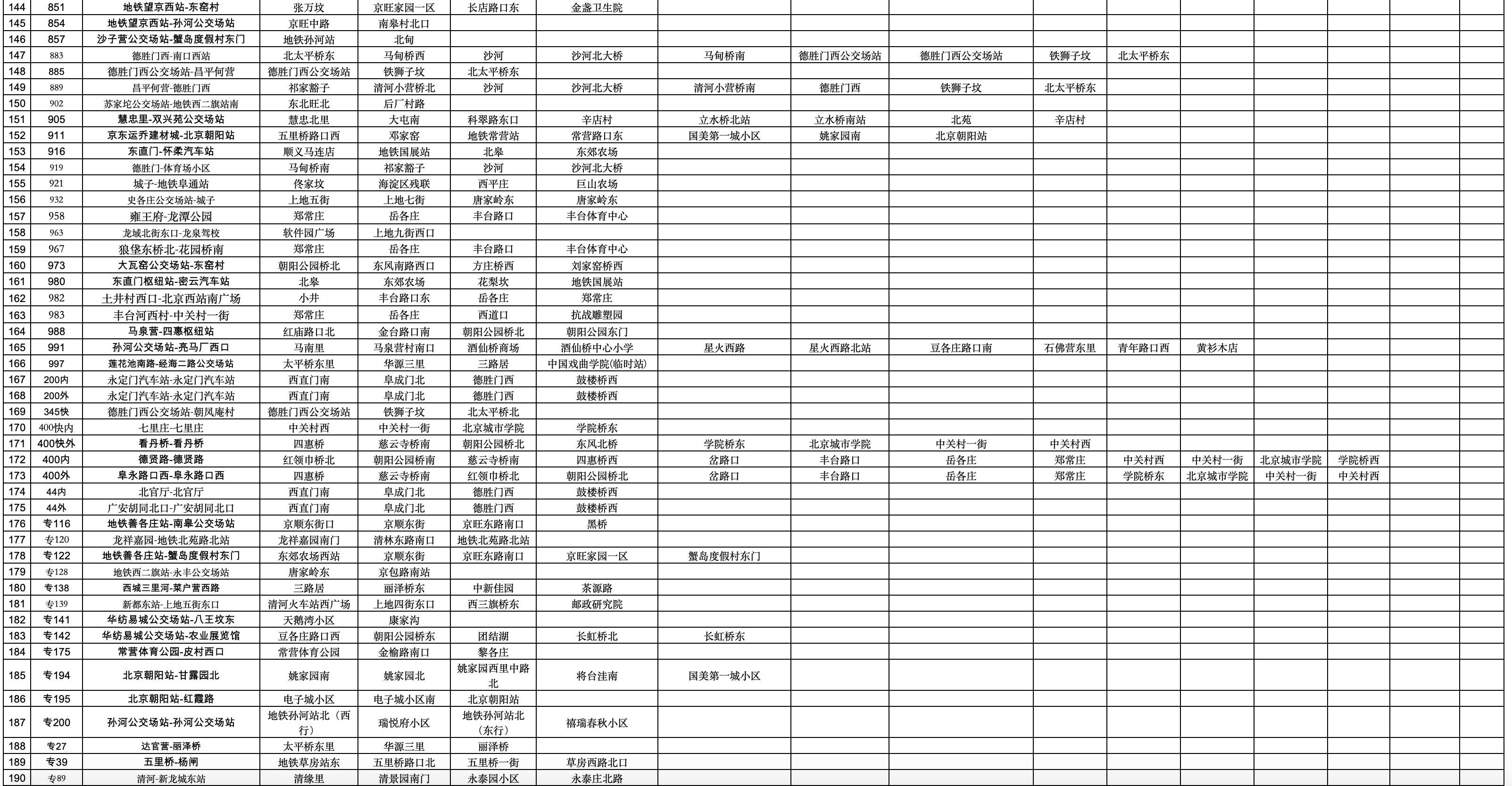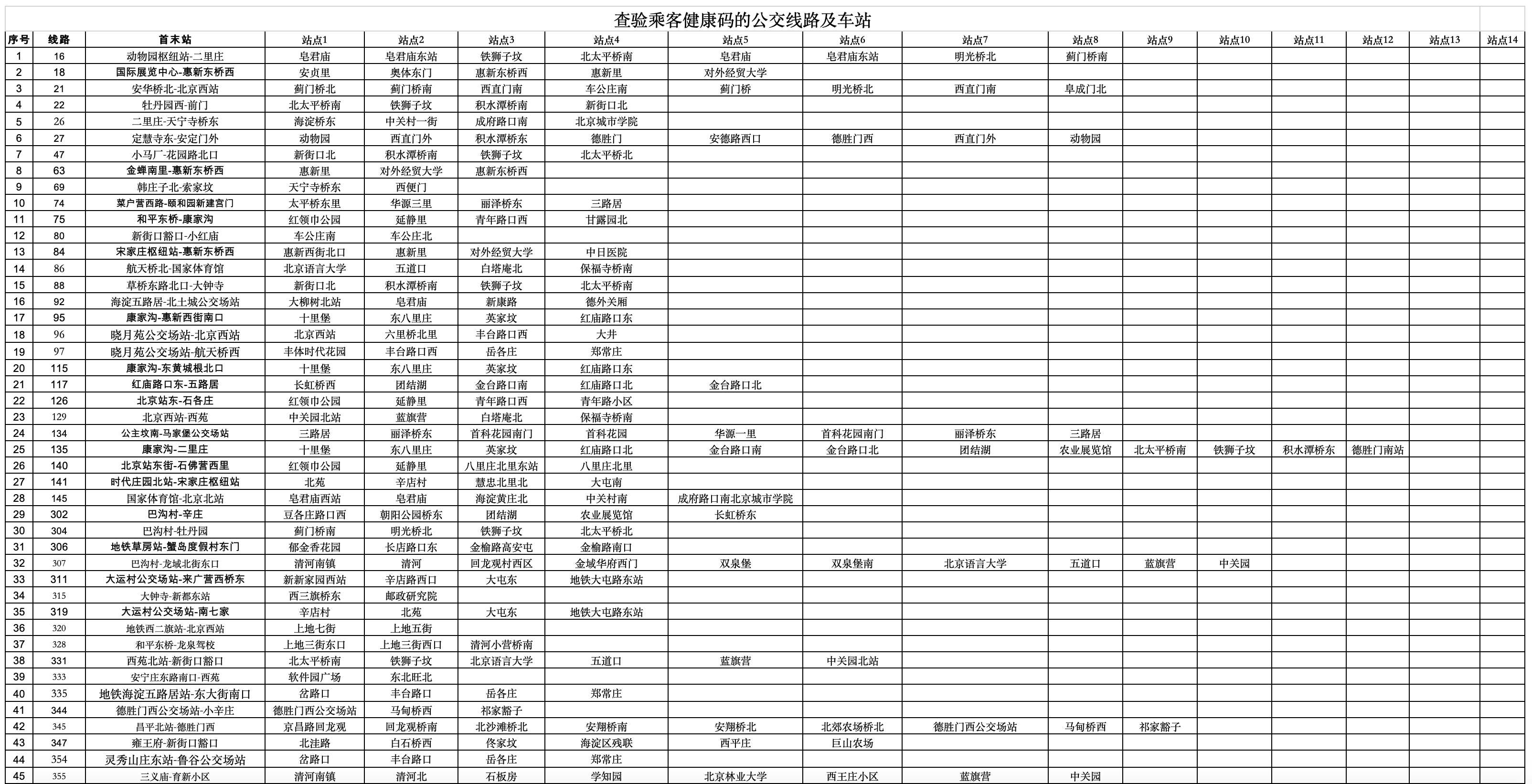 人民網(wǎng)北京5月16日電 (池夢蕊)根據(jù)北京市疫情防控需要,為做好精細精準防控,自2022年5月17日首班車起,北京市疫情防控封控區(qū)、管控區(qū)周邊的190條地面公交線路重點車站和54座地鐵車站(具體見附表),查驗乘客健康碼上車。后續(xù)將結合北京市疫情防控措施進行動態(tài)更新。