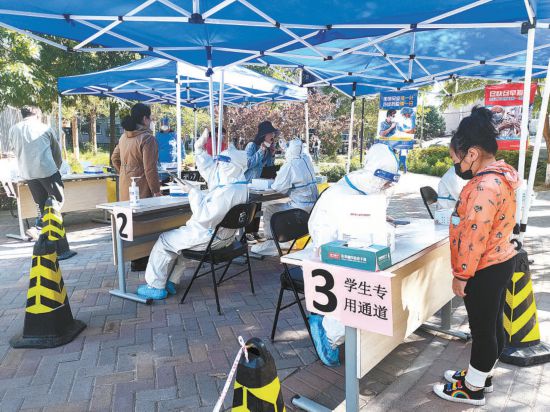 昨天,石景山區(qū)古城街道燕堤中街社區(qū)核酸檢測點設(shè)有學生檢測專用通道,方便學生隨來隨檢,不耽誤上網(wǎng)課。本報記者 吳鏑攝