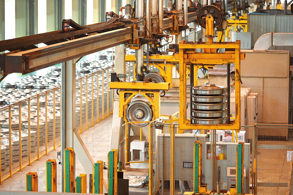 5月10日,太重軌道公司輪對生產(chǎn)車間檢測線上,工作人員正在對即將出廠的高鐵鋼輪進行檢驗。該公司將精益管理和改革創(chuàng)新當(dāng)做抓好各項工作任務(wù)的關(guān)鍵,深耕國際國內(nèi)市場,積極推進海外項目合作,穩(wěn)固國內(nèi)傳統(tǒng)市場行業(yè),打破傳統(tǒng)營銷方式,積極培育新模式、新業(yè)態(tài),不斷加強核心技術(shù)攻關(guān),拓展新的產(chǎn)品市場。(記者李兆民攝)
