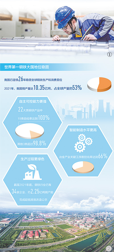 據(jù)中國(guó)鋼鐵工業(yè)協(xié)會(huì)統(tǒng)計(jì),與2012年相比,2021年,重點(diǎn)鋼鐵企業(yè)的平均噸鋼綜合能耗已由602.71千克標(biāo)煤降至550.43千克標(biāo)煤,與世界先進(jìn)水平的差距大幅縮??;噸鋼二氧化硫、煙粉塵的排放量降幅也分別達(dá)到了81.41%、63.44%。