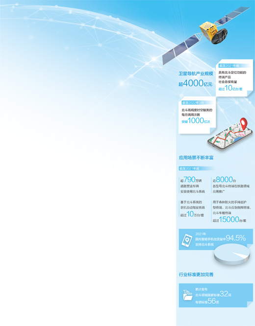 據(jù)統(tǒng)計,截至2021年底,已有超過790萬輛道路營運車輛安裝使用北斗系統(tǒng),近8000臺各型號北斗終端在鐵路領(lǐng)域應(yīng)用推廣,基于北斗系統(tǒng)的農(nóng)機自動駕駛系統(tǒng)超過10萬臺/套,手持巡護型終端、北斗應(yīng)急指揮終端、北斗車載終端超過15000臺/套用于森林防火,醫(yī)療健康、遠程監(jiān)控、線上服務(wù)等下游運營服務(wù)環(huán)節(jié)產(chǎn)值近2000億元。