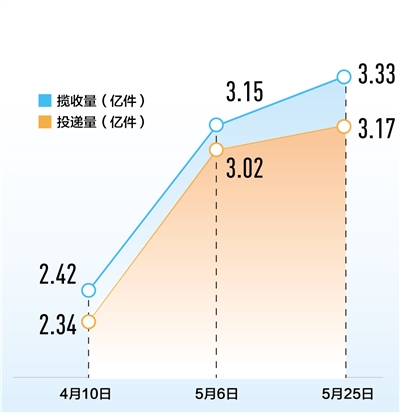 4月10日以來(lái),各地各部門多措并舉保通保暢,全國(guó)停運(yùn)的郵政快遞分撥中心和郵件快件積壓數(shù)均大幅下降。5月6日,全國(guó)郵件快件攬收、投遞量均恢復(fù)至3億件以上;5月28日,郵件快件攬收量約為3.14億件,投遞量約為3.22億件,均超過(guò)去年同期水平。