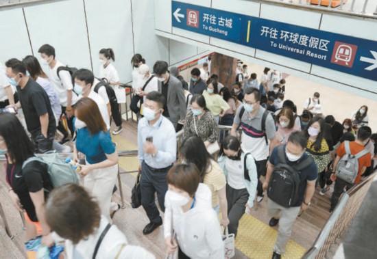 昨天早上八點(diǎn)半左右,地鐵國(guó)貿(mào)站呈現(xiàn)早高峰趨勢(shì)。 本報(bào)記者 劉平攝