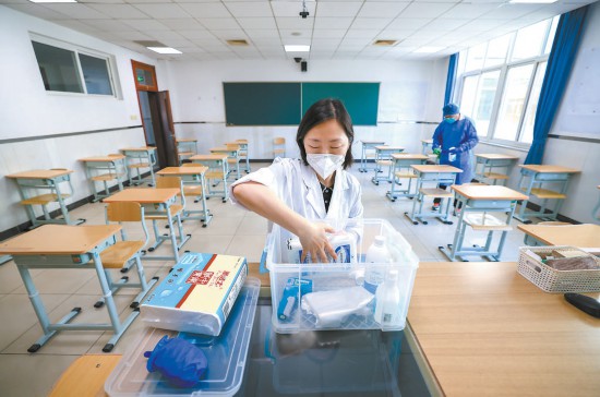 北京東直門(mén)中學(xué)考點(diǎn),老師正在展示考場(chǎng)配備的防疫物品箱,箱內(nèi)配備口罩、消毒酒精等防疫物品。 本報(bào)記者 潘之望攝