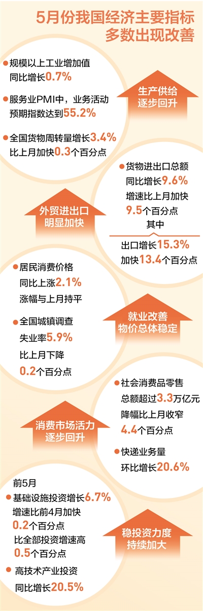 5月,我國經(jīng)濟運行出現(xiàn)積極變化,主要指標多數(shù)出現(xiàn)改善。
