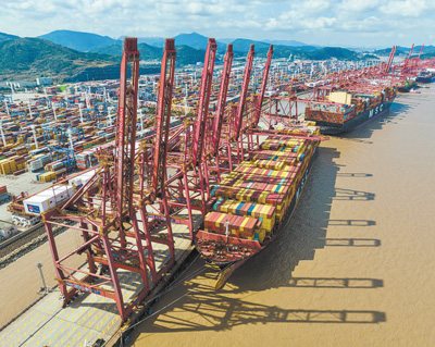 浙江寧波舟山港穿山港區(qū)集裝箱碼頭作業(yè)場(chǎng)景。