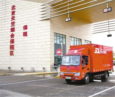 滿載快遞的物流車輛駛出北京天竺綜合保稅區(qū)。