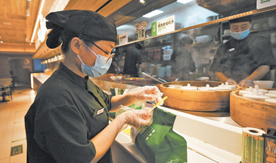 4月1日起,北京市正式實(shí)施《網(wǎng)絡(luò)餐飲服務(wù)餐飲安全管理規(guī)范》,明確入網(wǎng)商戶打包時(shí)“應(yīng)使用外賣包裝封簽或者一次性封口的外包裝袋等密封方式”。圖為海淀區(qū)一家餐飲企業(yè)店員粘貼外賣包裝封簽。