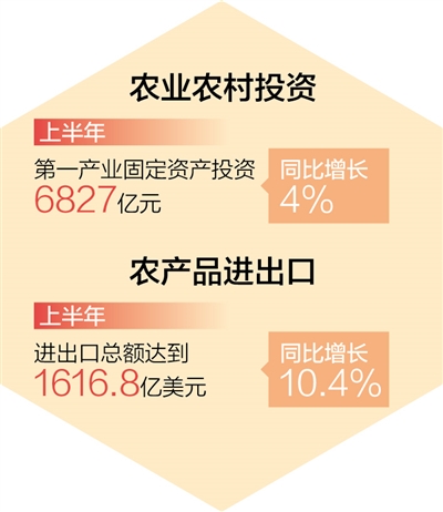 農(nóng)業(yè)農(nóng)村投資穩(wěn)步增長(zhǎng),農(nóng)村消費(fèi)市場(chǎng)逐步恢復(fù)。農(nóng)業(yè)農(nóng)村投資渠道拓寬。落細(xì)落實(shí)扎實(shí)穩(wěn)住經(jīng)濟(jì)一攬子政策措施,全力推動(dòng)重大政策落地實(shí)施和重大工程項(xiàng)目開(kāi)工建設(shè)。上半年,第一產(chǎn)業(yè)固定資產(chǎn)投資6827億元,同比增長(zhǎng)4%。鄉(xiāng)村消費(fèi)持續(xù)恢復(fù)。鄉(xiāng)村消費(fèi)品零售額2.77萬(wàn)億元,與去年基本持平,恢復(fù)到2019年的98%。農(nóng)產(chǎn)品進(jìn)出口保持增長(zhǎng)勢(shì)頭,進(jìn)出口總額達(dá)到1616.8億美元,同比增長(zhǎng)10.4%。