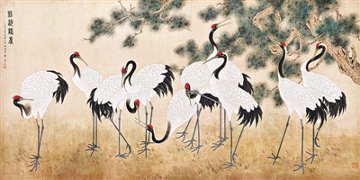 《松齡鶴壽圖》是陳之佛工筆花鳥中尺幅較大的一幅,是為慶祝中華人民共和國(guó)成立十周年的獻(xiàn)禮作。10只體態(tài)優(yōu)雅的丹頂鶴,安逸地徜徉于大地之上,或昂首唳天,或回首顧盼,或凝神遠(yuǎn)眺,蒼翠的古松由畫面右上方伸入,枝干蒼勁古樸,松枝郁郁蔥蔥,蘊(yùn)含著無限生機(jī)。陳之佛在中國(guó)畫傳統(tǒng)線描基礎(chǔ)上,將西洋畫和裝飾畫的線條加以改造后融入其中,使線條的表現(xiàn)力更為豐富。