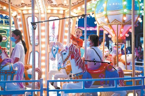 昨晚,北京經(jīng)開區(qū)大族廣場室外區(qū)域熱鬧非常,市民趁著夜色來這里吃飯、購物、游玩,廣場上的游樂設施前人頭攢動,孩子們在家長陪同下快樂玩耍。本報記者 和冠欣攝