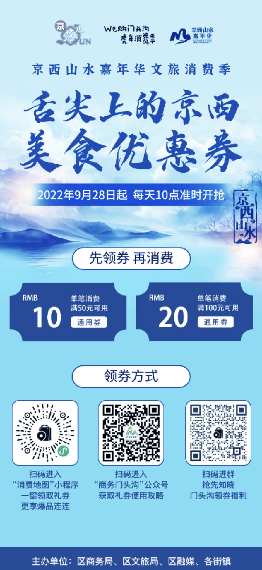 人民網(wǎng)北京9月28日電 (池夢蕊)9月28日上午10點,門頭溝區(qū)將準時啟動“舌尖上的京西”美食優(yōu)惠券發(fā)放活動,通過城市消費運營平臺“消費地圖-溝購有品”微信小程序面向市民發(fā)放,鼓勵市民來門頭溝區(qū)消費。