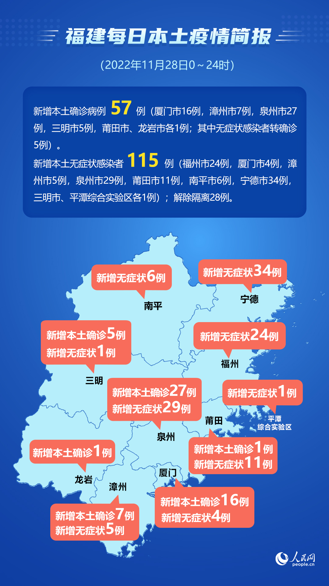 人民網(wǎng)福州11月29日電 (江葦杭、陳永整)據(jù)福建省衛(wèi)健委網(wǎng)站消息,11月28日0-24時,福建省報告新增本土確診病例新增本土確診病例57例(廈門市16例,漳州市7例,泉州市27例,三明市5例,莆田市、龍巖市各1例;其中無癥狀感染者轉(zhuǎn)確診5例)。當(dāng)日報告新增本土無癥狀感染者115例(福州市24例,廈門市4例,漳州市5例,泉州市29例,莆田市11例,南平市6例,寧德市34例,三明市、平潭綜合實驗區(qū)各1例);解除隔離28例。全省本土確診病例目前住院365例,無死亡病例;現(xiàn)有本土無癥狀感染者尚在接受集中隔離醫(yī)學(xué)觀察623例。