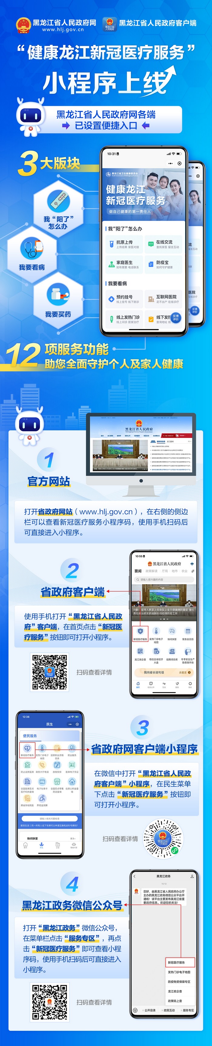 “健康龍江新冠醫(yī)療服務(wù)”小程序已經(jīng)正式上線,為了讓全省人民更加便捷地找到小程序,及時獲取服務(wù),黑龍江省人民政府網(wǎng)站、官方客戶端、小程序、官方微信公眾號等平臺已全面開通“健康龍江新冠醫(yī)療服務(wù)”便捷入口。3大板塊12項服務(wù)功能助您全面守護個人及家人健康。