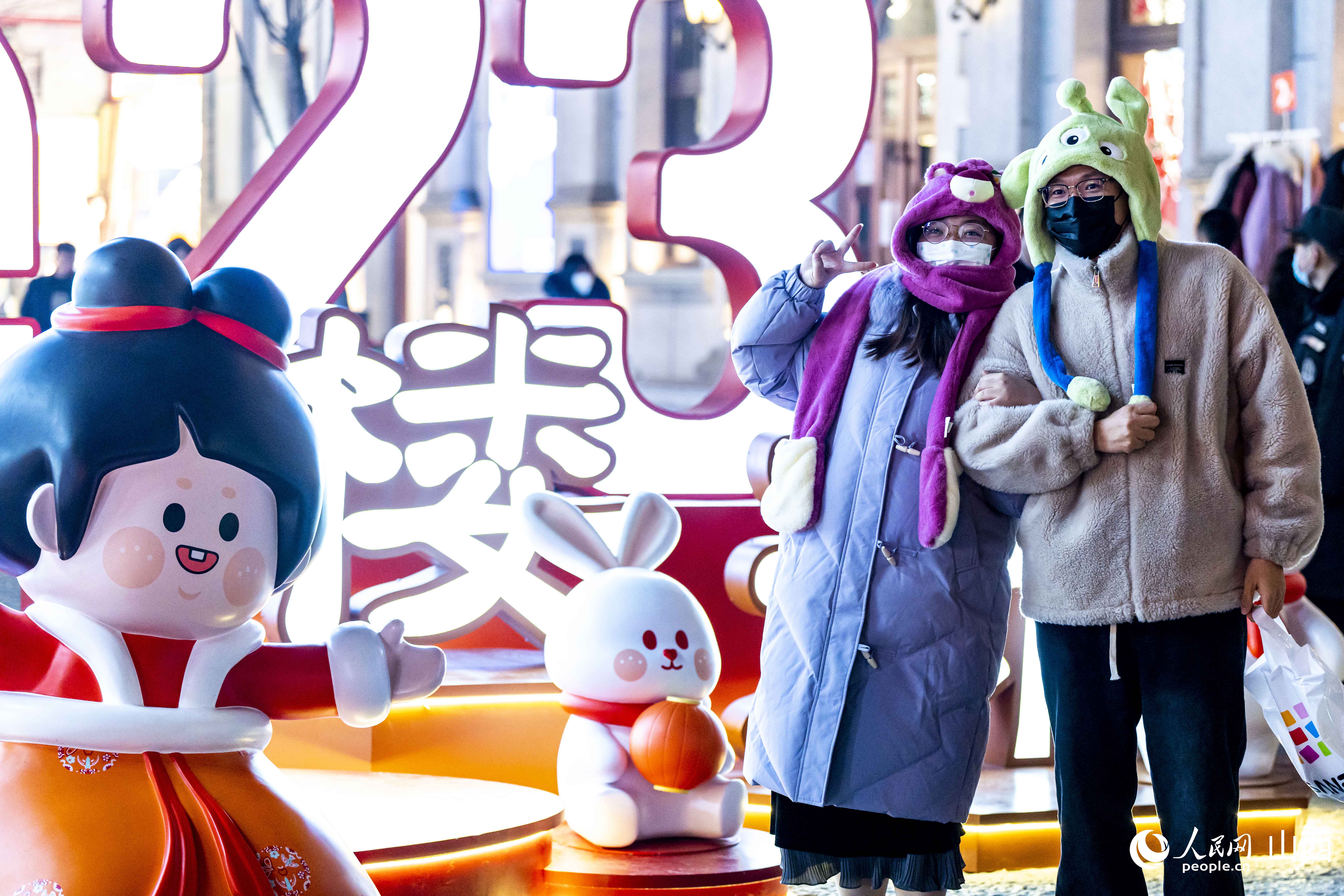 每逢夜幕降臨,鐘樓街上燈光璀璨,人頭攢動。隨處可見的新年兔子元素,為城市增添了年味,游客紛紛駐足拍照,喜氣洋洋,年味兒十足。