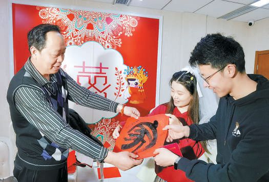 昨天,在石景山區(qū)婚姻登記處,新人收到飽含祝福的書法作品。 本報記者 吳鏑攝