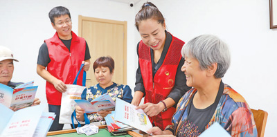 濱城區(qū)彭李街道學(xué)府社區(qū)志愿者在向居民講解防范養(yǎng)老詐騙知識。李 默 任增亮攝影報道