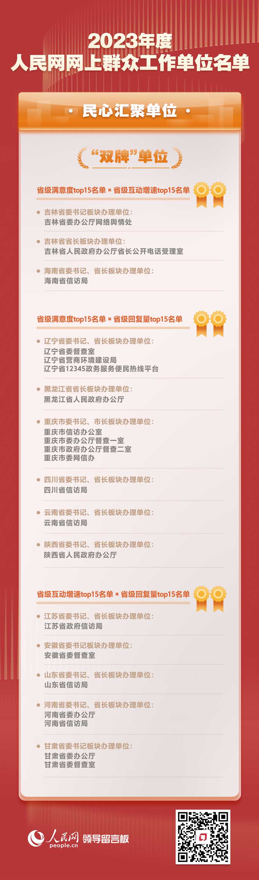 此次公布的名單綜合全國各地區(qū)各部門各單位近一年來的滿意度、互動增速、回復(fù)量等指數(shù),著重突出各地區(qū)各部門各單位依托人民網(wǎng)“領(lǐng)導(dǎo)留言板”開展網(wǎng)上群眾工作情況,選出2023年度人民網(wǎng)網(wǎng)上群眾工作“民心匯聚單位”“實干擔(dān)當(dāng)單位”“匯智為民單位”和“活力奮進(jìn)單位”。