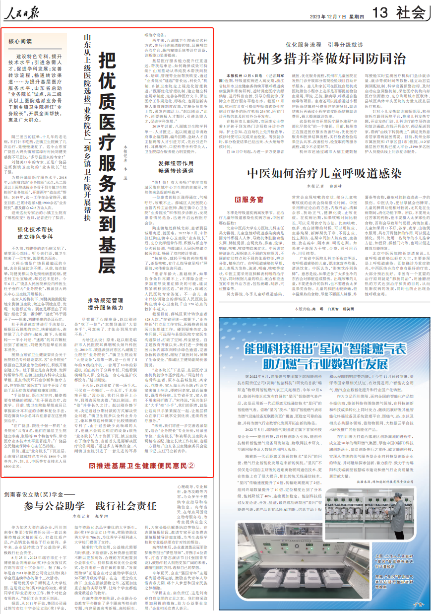 建設(shè)特色專(zhuān)科,提升技術(shù)水平;引進(jìn)急需人才,促進(jìn)學(xué)科發(fā)展;完善轉(zhuǎn)診流程,暢通轉(zhuǎn)診渠道……為提升基層醫(yī)療服務(wù)水平,山東省啟動(dòng)“業(yè)務(wù)院長(zhǎng)”試點(diǎn),從二級(jí)及以上醫(yī)院選派業(yè)務(wù)骨干到鄉(xiāng)鎮(zhèn)衛(wèi)生院擔(dān)任“業(yè)務(wù)院長(zhǎng)”,開(kāi)展全面幫扶,惠及廣大群眾。