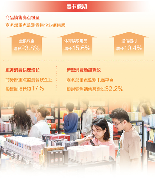 數(shù)據(jù)顯示,春節(jié)假期商品銷售亮點紛呈。春節(jié)假期,節(jié)慶商品、國貨潮品、綠色智能產品等持續(xù)旺銷。商務部重點監(jiān)測零售企業(yè)金銀珠寶、體育娛樂用品、通信器材銷售額同比分別增長23.8%、15.6%和10.4%。