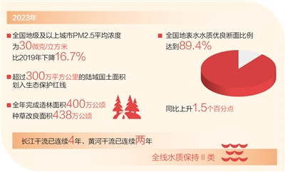 2023年,全國地級及以上城市PM2.5平均濃度為30微克/立方米,比2019年下降16.7%;全國地表水水質優(yōu)良斷面比例達到89.4%,同比上升1.5個百分點;超過300萬平方公里的陸域國土面積劃入生態(tài)保護紅線。