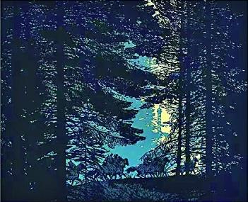 面對(duì)彼時(shí)套色木刻創(chuàng)作存在的這一問題,晁楣通過不懈研究與探索找到了解決的方法。他放棄了過去以黑線勾勒輪廓再以彩色填充的方式,大膽采用色塊拼接的新方法,將黑色與彩色并置在畫面中,使黑色輪廓線融入暗部,統(tǒng)一為一個(gè)個(gè)整體色塊。晁楣強(qiáng)調(diào),套色木刻中不能沒有黑色,因?yàn)樗诋嬅嬷邪l(fā)揮著重要的作用。這種“剪影式”的構(gòu)圖大量削減了輪廓線在畫面中的應(yīng)用,帶來強(qiáng)烈的色彩對(duì)比以及極具視覺張力的疏密關(guān)系,使得畫面結(jié)構(gòu)主次分明,保持了作品的整體感。試看晁楣的套色木刻作品《北陲屏障》,逆光的環(huán)境中,頂天立地、枝繁葉茂的松樹剪影占據(jù)了畫面的大部分空間,在遠(yuǎn)處光源的照耀下,一隊(duì)騎乘戰(zhàn)馬的巡邏兵疾馳而過,形成了動(dòng)靜交織的畫面節(jié)奏。作品用為數(shù)不多的色彩營造光感,套色簡潔自然,茂密枝干交織形成的無數(shù)小色塊,展現(xiàn)出藝術(shù)家精湛的運(yùn)刀技藝。