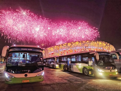 2月4日晚,北京冬奧會(huì)開(kāi)幕式焰火與保障車輛“同框”。本版圖片/北京市交通委員會(huì)供圖