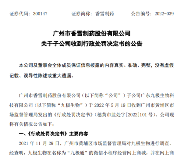 對此,香雪制藥表示,已要求九極生物主動調(diào)整生產(chǎn)計劃,更改下架相關(guān)廣告;對相關(guān)責(zé)任人員進行處罰;組織工作人員對相關(guān)法律法規(guī)進行學(xué)習(xí),完善內(nèi)部管理制度與操作規(guī)程,嚴(yán)格按照規(guī)定對產(chǎn)品宣傳進行規(guī)范管理。截至本公告披露日前,相關(guān)整改已完成。