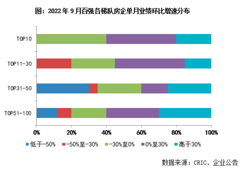 具體從企業(yè)表現(xiàn)來看,克而瑞報告顯示,2022年9月超半數(shù)百強房企實現(xiàn)單月業(yè)績環(huán)比增長,其中30家企業(yè)的環(huán)比增幅在0%到30%之間,25家企業(yè)環(huán)比增幅超過30%。如華潤、招商、綠地、越秀、仁恒等企業(yè)的環(huán)比增幅均在35%以上。但從業(yè)績同比來看,目前規(guī)模房企整體仍深陷負增長困局,9月單月業(yè)績同比降低的企業(yè)數(shù)量達到近7成,僅3成企業(yè)實現(xiàn)了單月業(yè)績同比增長。