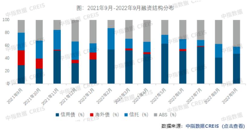 2022年1-9月,房地產(chǎn)企業(yè)非銀融資總額7331.5億元,同比下降52.6%。從融資結(jié)構(gòu)來看,信用債占比50.2%,同比提升19.9個百分點;海外債占比僅為2.4%,同比下降14.0個百分點;信托占比16.0%,同比下降15.1個百分點;ABS占比31.4%,同比提升9.3個百分點。前三季度非銀融資總額分別占比33.1%、35.1%、32.1%,各季度融資比例差異不大,并未出現(xiàn)明顯的融資高峰期。