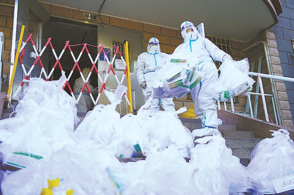 近日,朝陽區(qū)東湖街道利澤西園一區(qū)社區(qū)“大白”逐戶為封控居民送抗原試劑盒,分發(fā)蔬菜包等生活必需品。 本報(bào)記者 程功攝