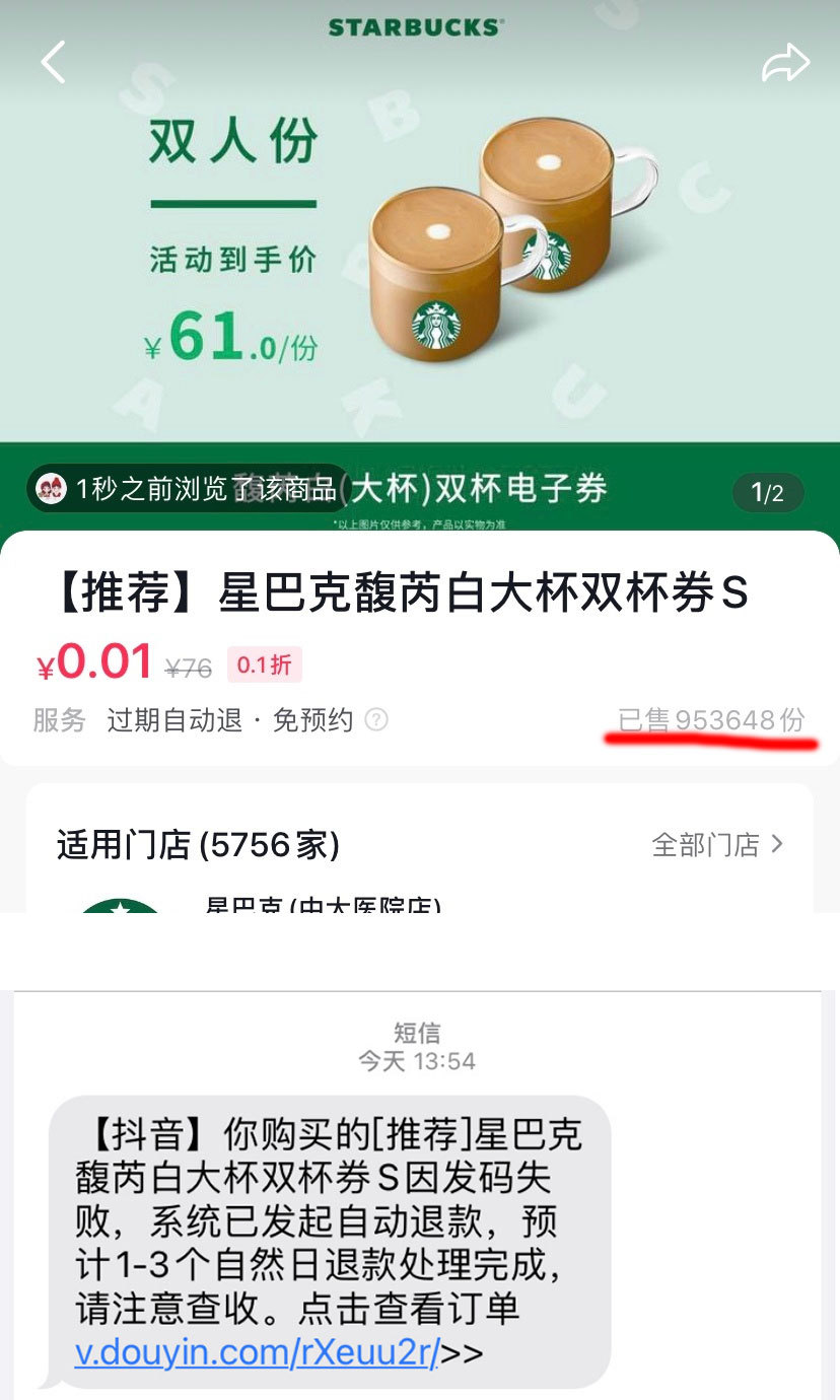 央廣網(wǎng)記者注意到,23日有多名網(wǎng)友在社交平臺(tái)微博反饋,星巴克近日在某平臺(tái)推出0.01元購(gòu)2杯馥芮白咖啡券團(tuán)購(gòu)活動(dòng),賣出95萬多單。但是不少消費(fèi)者表示搶券后,發(fā)現(xiàn)無法兌換,被星巴克自動(dòng)退款了。